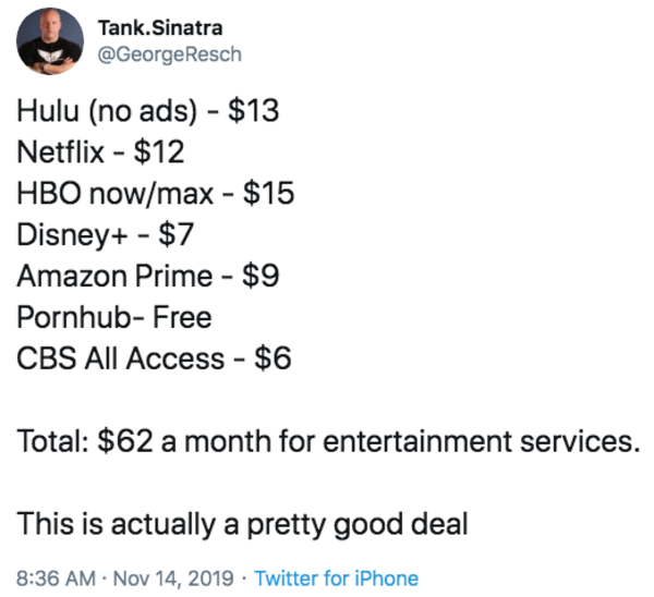 Hulu No Ads 13 Netflix 12 Hbo Now Max 15 Disney 7 Amazon Prime 9 Pornhub Free Cbs All Access 6 Total 62 A Month For Entertainment