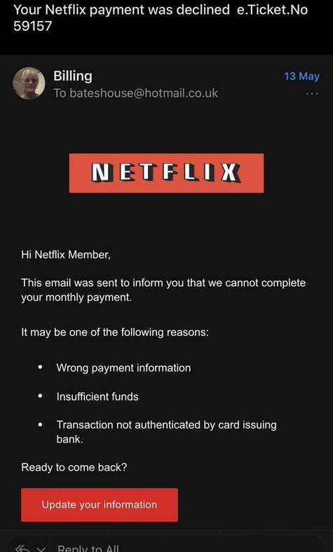 Netflix Scam Email Phishing Message Seeking Updated Payment Info Reported